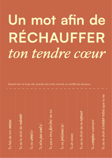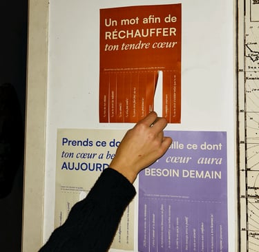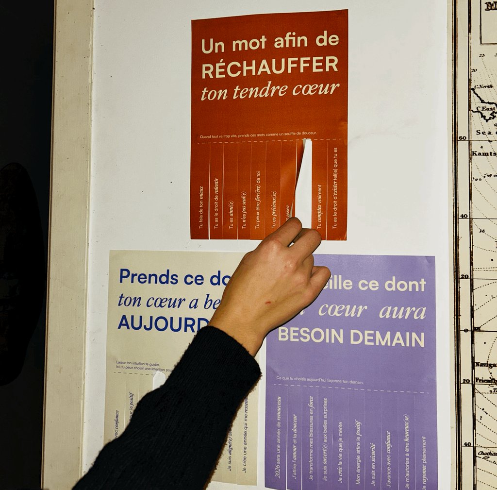 J’ai créé des affiches à languettes — comme celles où l’on arrache un numéro de téléphone — mais à la place, j’y ai inscrit des intentions, des mots doux, des manifestations.