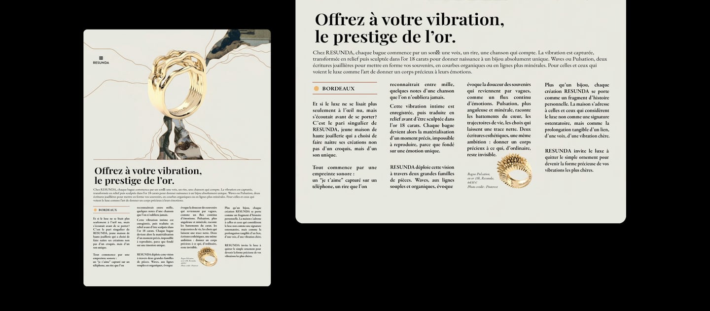 Dans un monde où le luxe se doit d'incarner l'émotion et l'unicité, RESUNDA réinvente la haute joaillerie bordelaise en transformant chaque vibration sonore personnelle en relief d'or précieux, faisant de chaque bague un souvenir tangible et sculpté sur mesure.