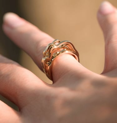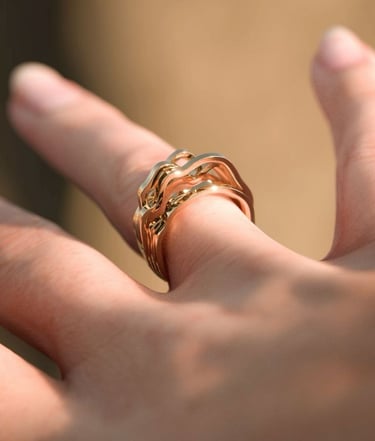 Pour la gamme Waves, les lignes qui contiennent les souvenirs adoptent des contours plus souples et continus. Elles glissent et se répondent comme des vagues, traduisant la fluidité des émotions, la douceur des instants partagés et la dimension organique de la mémoire. La bague RESUNDA Waves devient alors la trace sensible de ces mouvements intérieurs, un relief d’or qui épouse la courbe des sentiments.