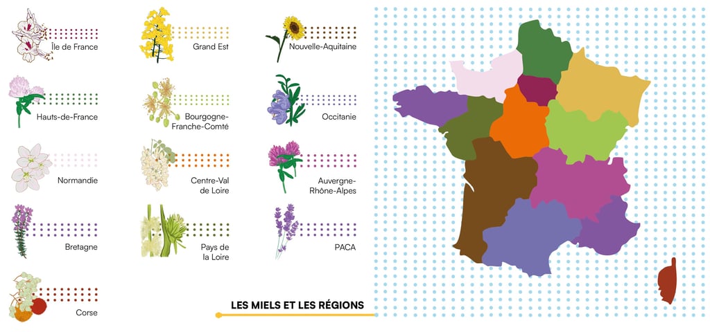 Un système chromatique qui illustre la diversité des terroirs apicoles français, permettant d’identifier d’un coup d’œil l’origine, l’identité et l’histoire de chaque miel.